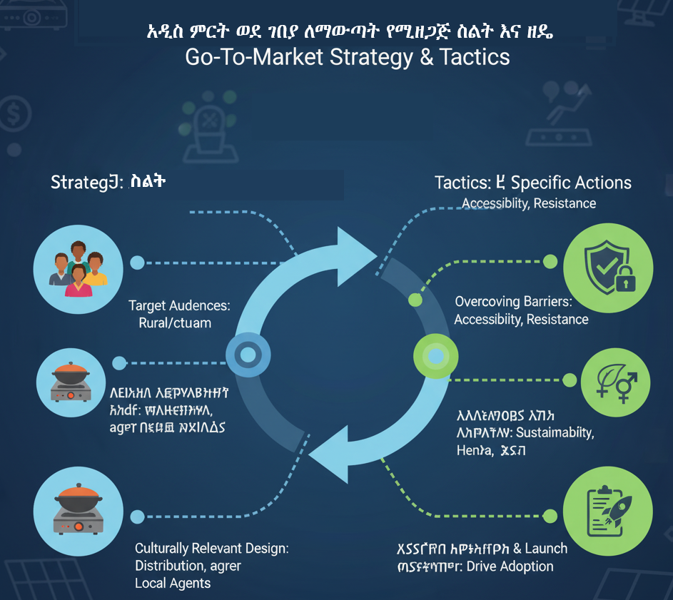 በዚህ ሞጁል ውስጥ ለንጹህ የማብሰያ ምርት የሚስማሙ ወደ ገበያ ማለፊያ ስትራቴጂዎችና ስልቶችን እንዴት እንደሚያዘጋጁ ይማራሉ፡፡ እንደ የትኩረት ደንበኞችን መለየት፣ በዋጋ ተማጣጣኝ እና ለባህል አግባብነት ያላቸው መፍትሄዎች ማዘጋጀት፣ እና ውጤታማ የማከፋፈያ መንገዶችን መምረጥ የመሳሰሉ ዋና ዋና ንድፈ ሀሳቦችን ያጠናሉ፡፡ በስትራቴጂ (አጠቃላይ ዕቅድ) እና ስልቶች (ልዩ እርምጃዎች) መካከል ያለውን ልዩነት በመረዳት ምርትዎን ወይም አገልግሎትዎን የሚያስጀምሩበት ፍኖተ ካርታ የሚያዘጋጁበት እውቀት ያገኛሉ፡፡ በተግባር መሳሪያዎች እና የእውነተኛው ዓለም ምሳሌዎች አማካኝነት እንደ ውሱን ተደራሽነት፣ የባህል ተቃውሞ እና የዋጋ ተመጣጣኝነት ችግሮች የመሳሰሉ እንቅፋቶችን የሚፈቱባቸው ግንዛቤዎችን ከማግኘት በተጨማሪ አቀራረብዎን እንደ ዘላቂነት እና የጤና ማሻሻያ ከመሳሰሉ ሰፊ ግቦች ጋር ያስማማሉ፡፡ ይህ ሞጁል ሲያበቃ ንጹህ የምግብ ማብሰያ መፍትሄዎን በራስ መተማመን ወደ ገበያ የሚያቀርቡባቸውና በትኩረት ደንበኞችዎ ተቀባይነት የሚያገኙባቸውን ክህሎቶች ያገኛሉ፡፡